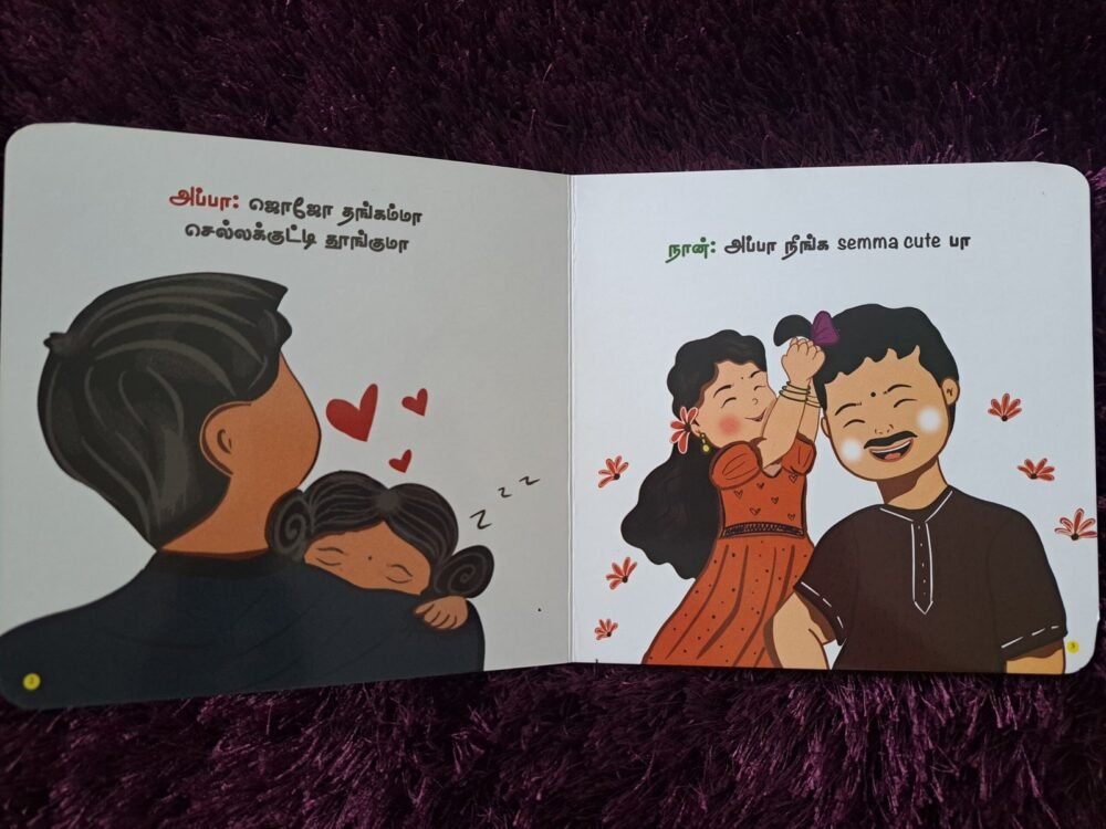 Designed with thick, durable board pages, this book is safe for tiny hands and curious fingers. The simple Tamil text and cheerful illustrations help children recognize everyday moments of love, care, and play shared with their father.