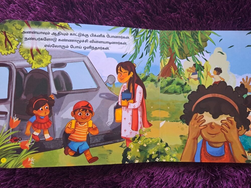 Kana Muchi Re Re Kandupudi Yaaru? (கண்ணாமூச்சி ரே ரே கண்டுபிடி யாரு ?) is an engaging Tamil board book for babies and toddlers, designed to encourage observation, guessing, and interactive learning through a playful hide-and-seek-style story. Children are invited to explore the pages, find hidden surprises, and guess “who did it?”—turning reading into a fun and engaging activity.