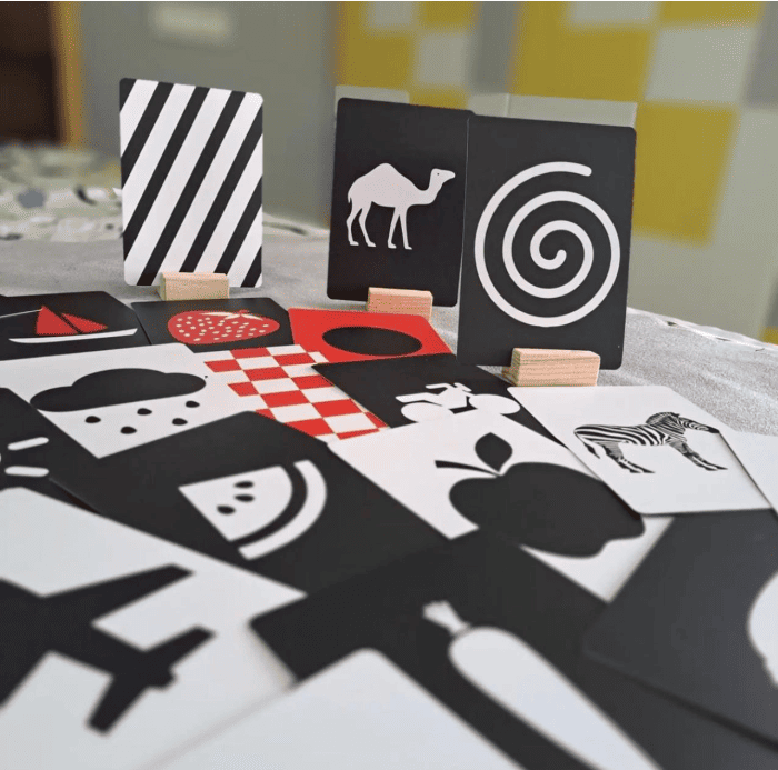 Specially designed for newborn eyes. High-contrast black, white, and red flashcards paired with smooth wooden blocks gently support early vision and sensory development.