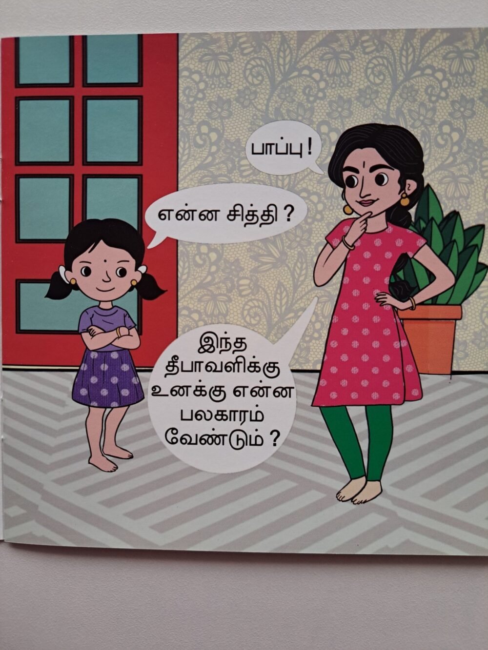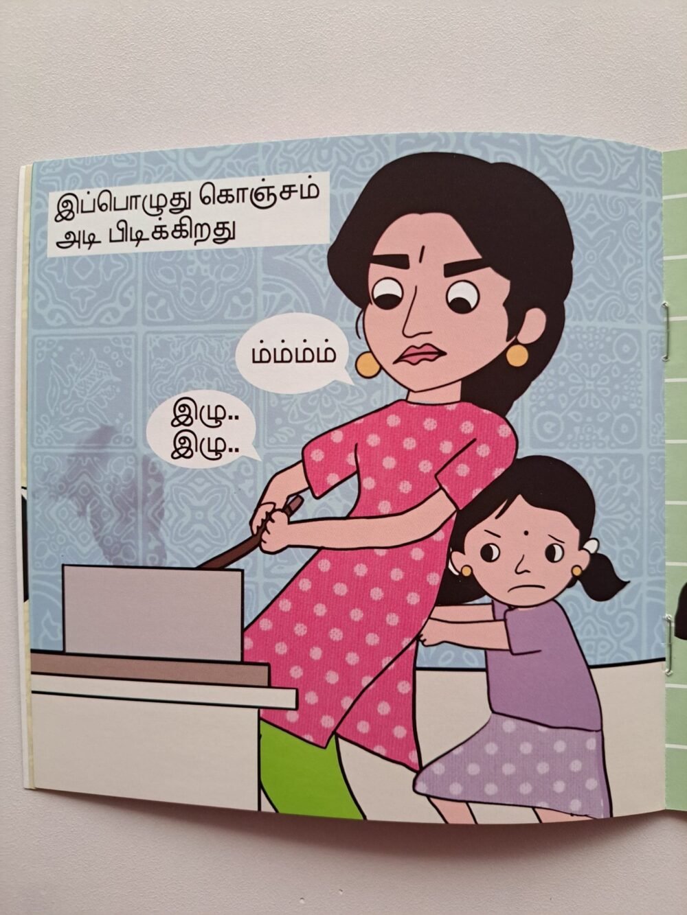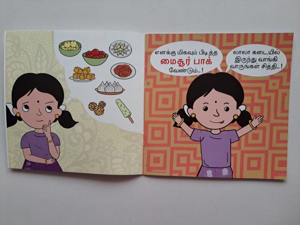 Palagaram (பலகாரம்) is a thoughtfully designed Tamil paperback book for babies and toddlers, created to introduce children to Tamil letters and words in a playful, age-appropriate way. Each page features clear, simple Tamil text paired with engaging illustrations, helping children recognize letters, connect them to familiar objects, and develop early vocabulary.