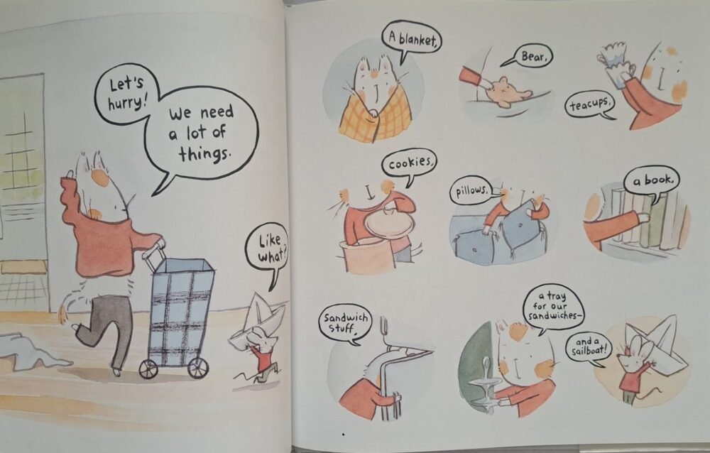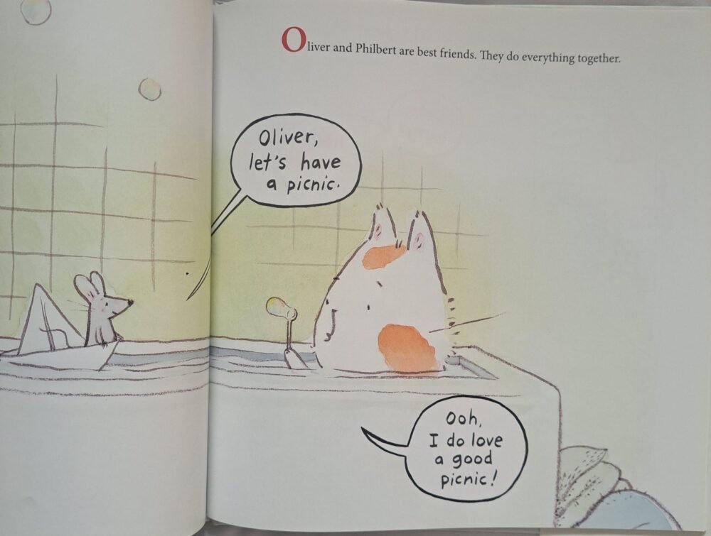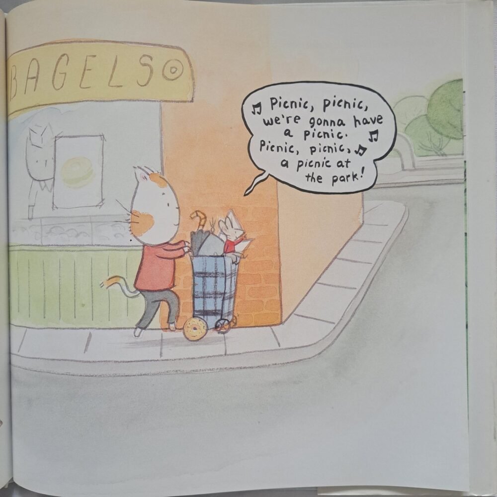 Oliver the cat and Philbert the mouse are the very best of friends, and they’re heading out for a picnic together. But as any mom knows, plans don’t always go smoothly. When their picnic cart breaks, Philbert comes up with a creative fix using a bagel as a wheel! Later, when Philbert finds himself in trouble on the water, Oliver uses quick thinking to help save the day.