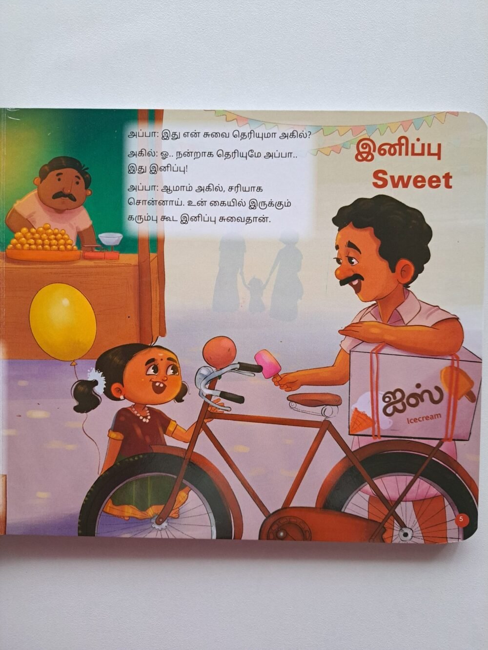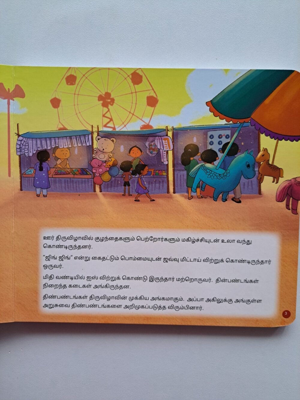 Suvai Thiruvizha (சுவை திருவிழா) is a delightful Tamil board book for kids that introduces little ones to the colorful world of tastes and traditional foods. With sturdy pages, simple Tamil words, and bright illustrations, it makes learning joyful and relatable for young children.