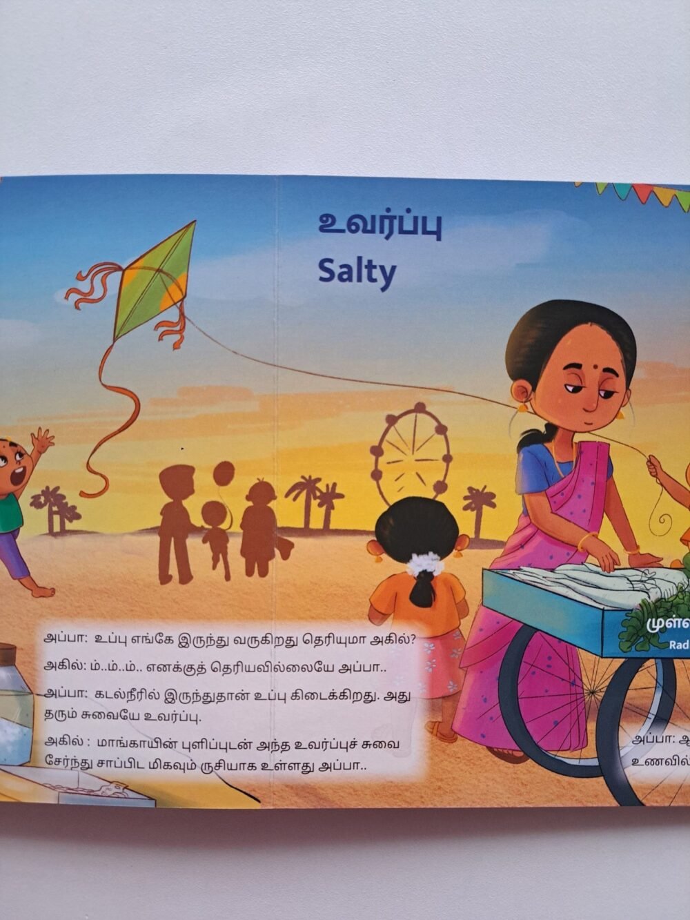 Suvai Thiruvizha (சுவை திருவிழா) is a lovingly designed Tamil board book for babies and toddlers, inspired by the joy of food, festivals, and shared family meals. This book gently introduces children to different tastes, foods, and food-related words in a fun, age-appropriate way.