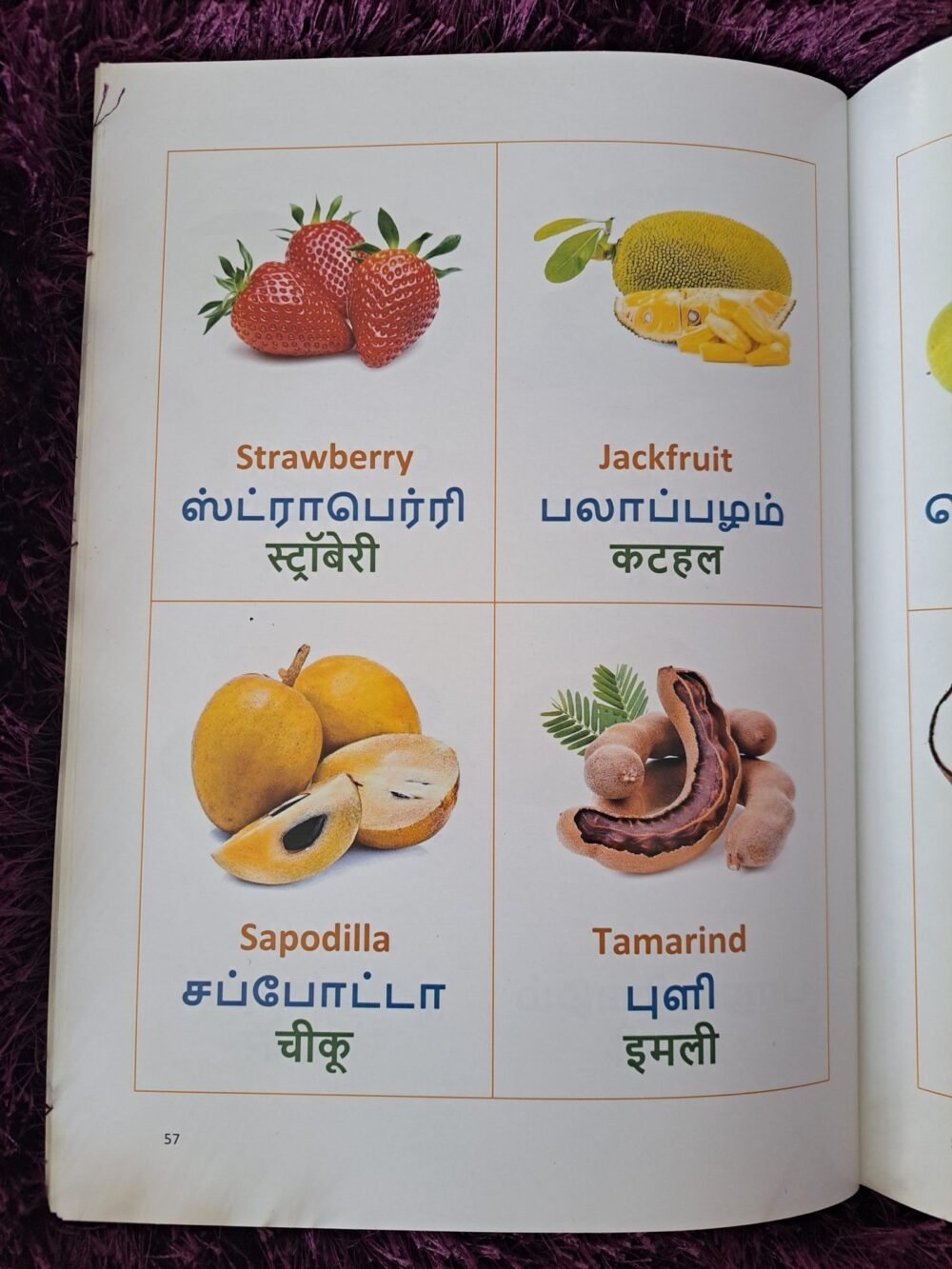 Tri Lingual is a beautifully designed paperback early learning book that introduces children to English, Tamil, and Hindi through simple words and colorful illustrations. Perfect for little learners, it gently builds vocabulary while making learning fun, familiar, and meaningful at home.